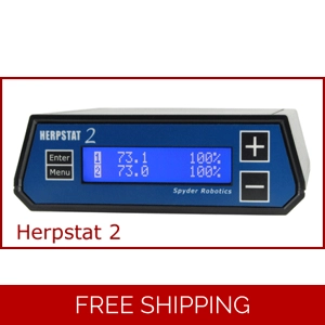 These advanced controllers can be used for precision temperature control, lighting control, and even humidity control. Housed in desktop style cases they can easily sit on top of your rack, cage, or incubator. Dual proportional temperature controlling modes (Dimming or Pulse) are built in so you can choose the mode that works best with your setup. A built in soft startup feature will slowly add power on initial starts as well as a user selectable ramping between day and night time temperature settings. A new revolutionary auto power matching algorithm constantly adjusts the power output to get the best regulation possible. We also added new AC control code that lets the device adjust power in 100 steps to be able to finely tune the heating equipment. High and low temperature tracking and audible alerts are standard. Possibly one of the most important new features is the built in safety relay that can disconnect power to the outlets in case of a solid state control failure as well as a timeout function that can cut power if the user's low temperature is not reached within 30 minutes. Three prong grounded outlets are standard assuring compatibility with most heating devices. The Herpstat 2 adds a second outlet/probe and has independant settings.
